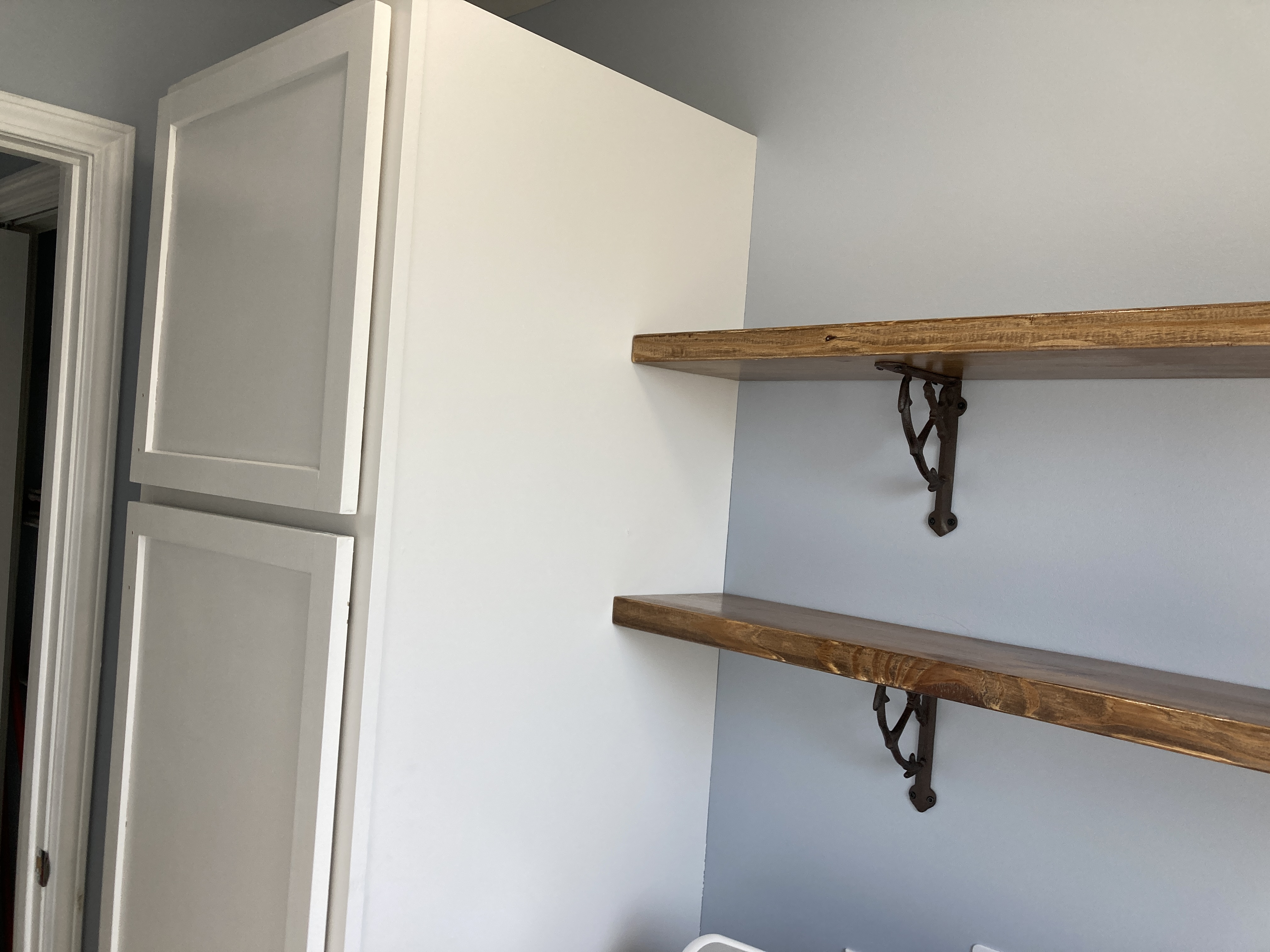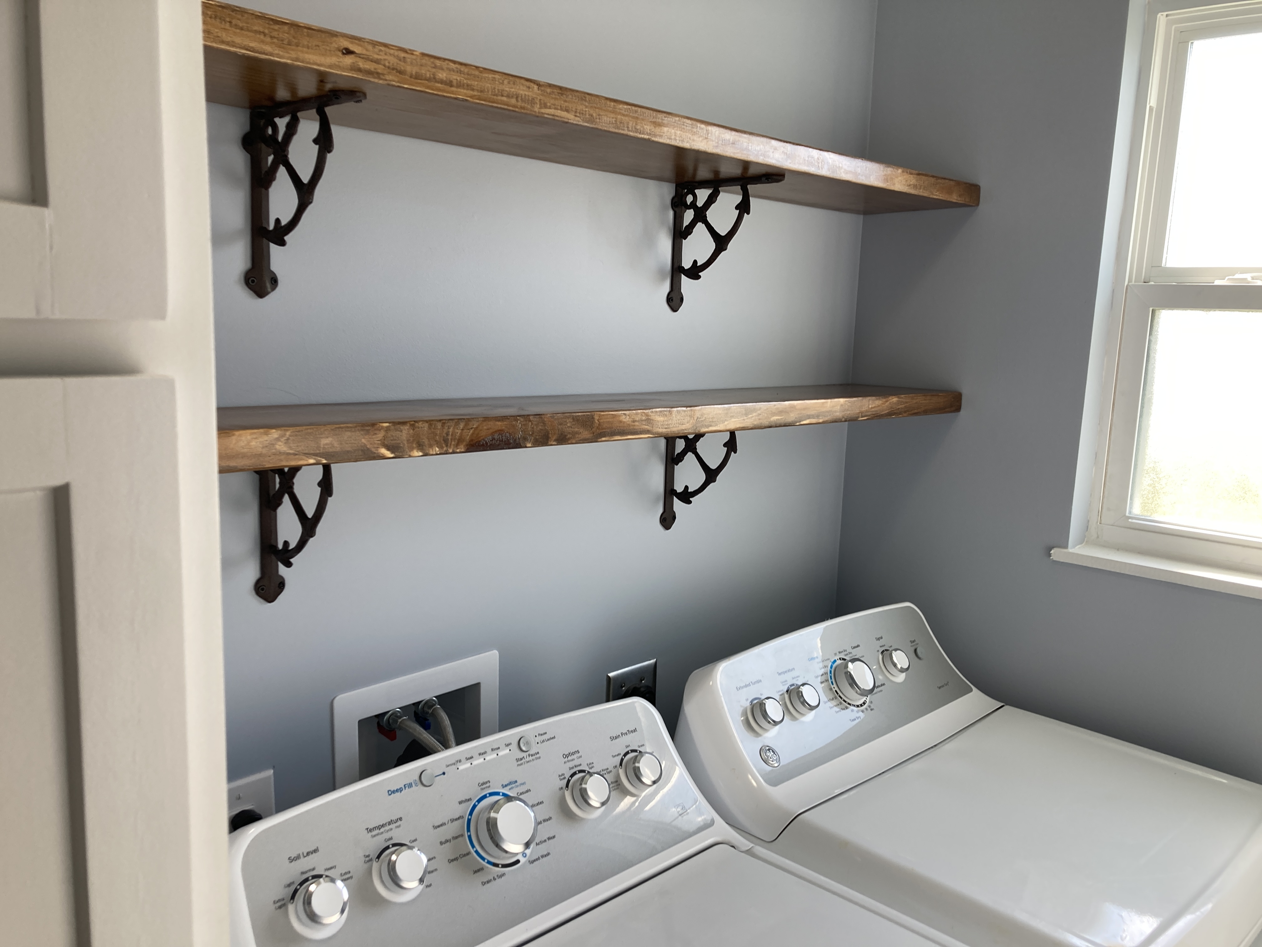 We added custom, stained open shelving and a pantry cabinet to this Bay St. Louis utility room, matching the upgraded kitchen.